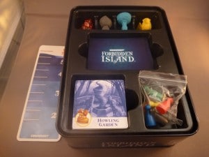 “Forbidden Island’s” goal is to gather four identical treasure cards for each of the treasures, go to one of two “special” tiles for that treasure and discard the cards to claim the treasure. Finally, after claiming all the treasures, get all players to “Fool’s Landing,” the helipad tile, and play an “airlift” card. It is far harder than it sounds.
